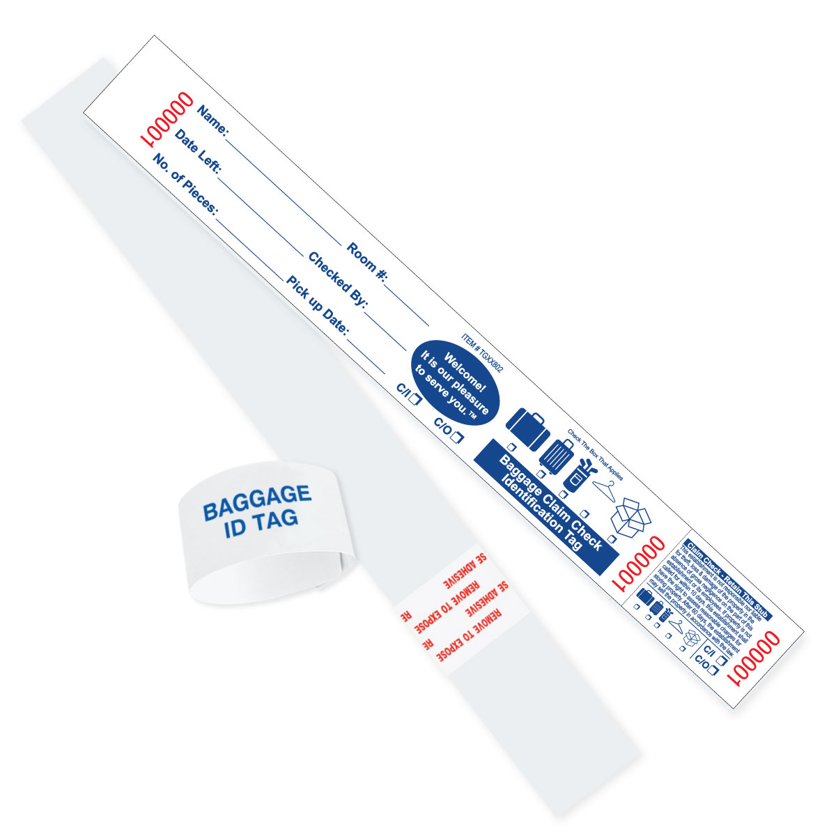TGXX801D2Luggage identification tags with transfer tape are designed & manufactured to help in managing and controlling luggage and baggage in hotels & where storage management is required. Made on bright yellow material these tags are easy to locate from a distance. Tags are consecutively numbered in red ink and have a claim ticket that easily separates from tag to give to your client. With this claim ticket your customer can reclaim items at a later time. These bag ID tags are a must have product in organizing and storing of items.Usage