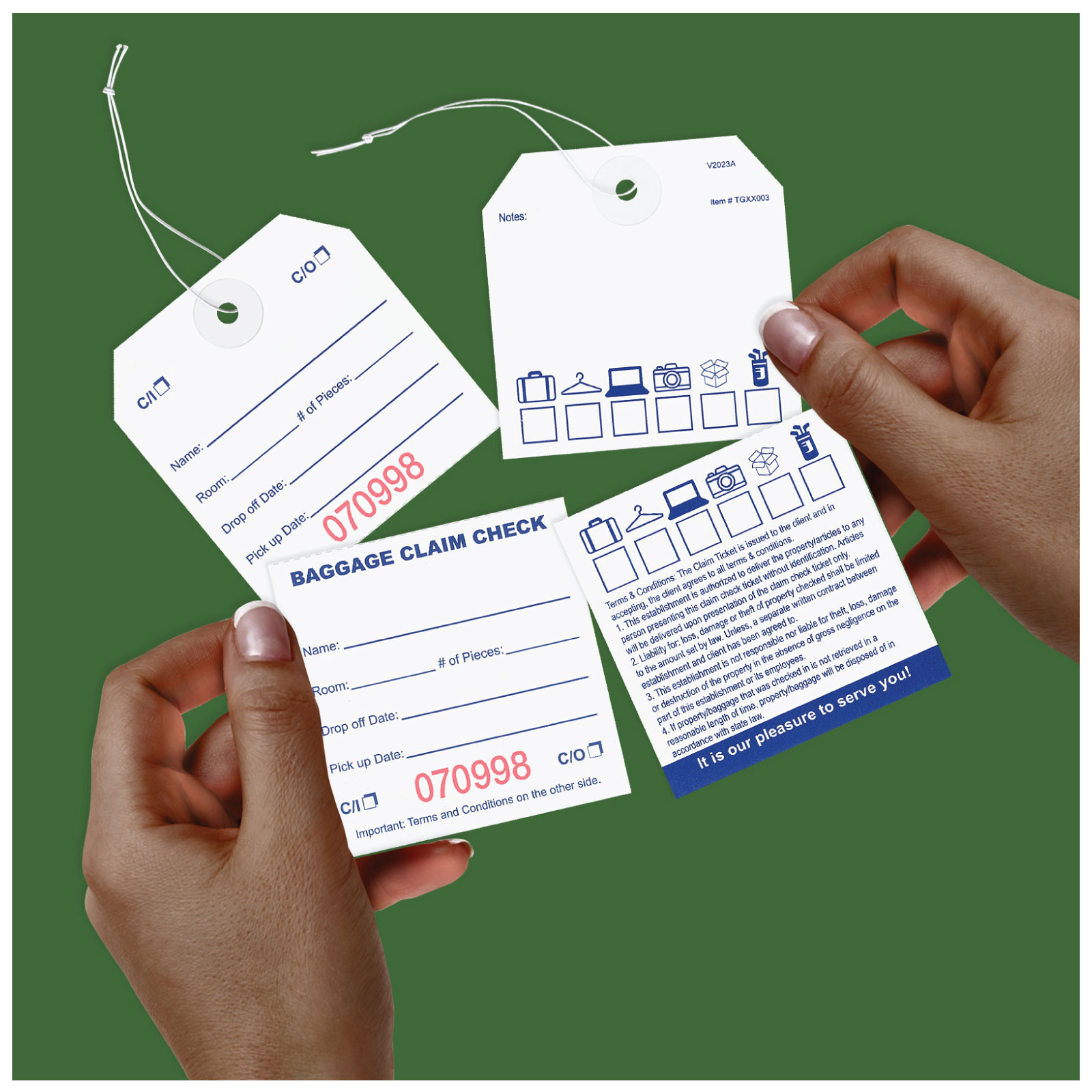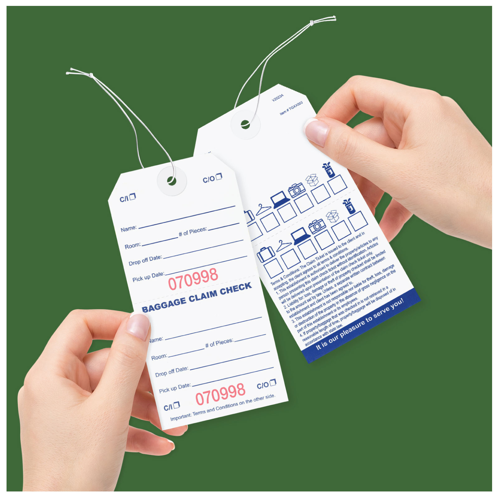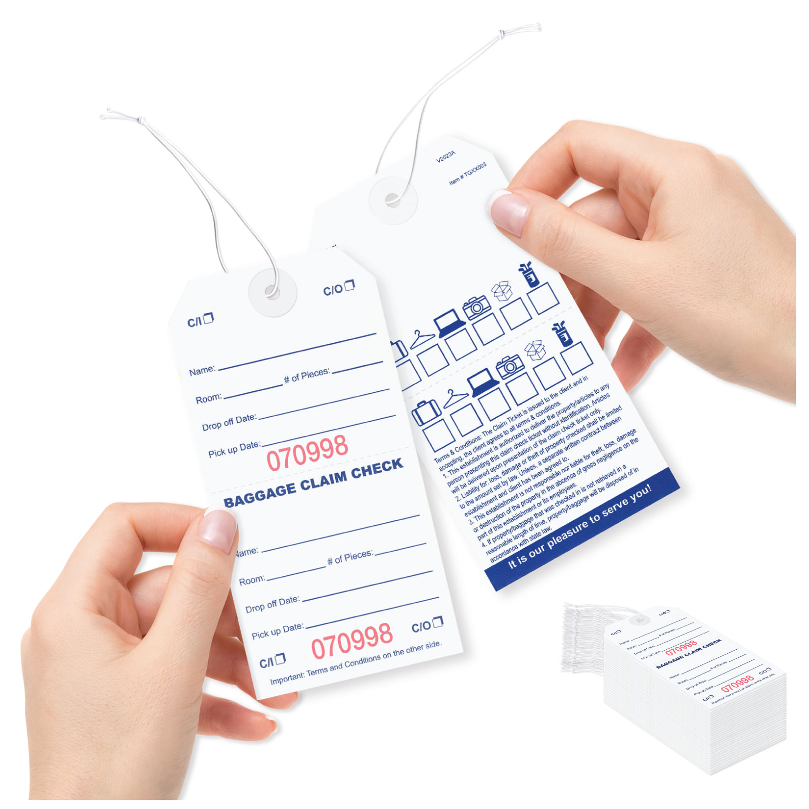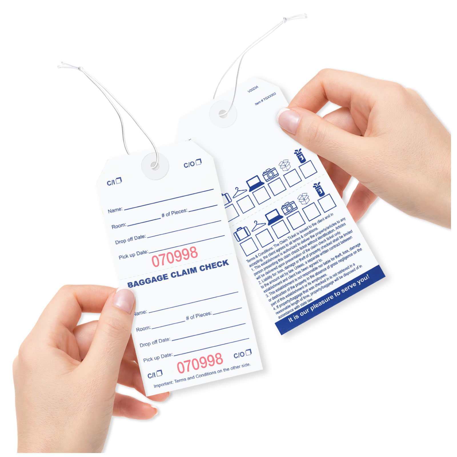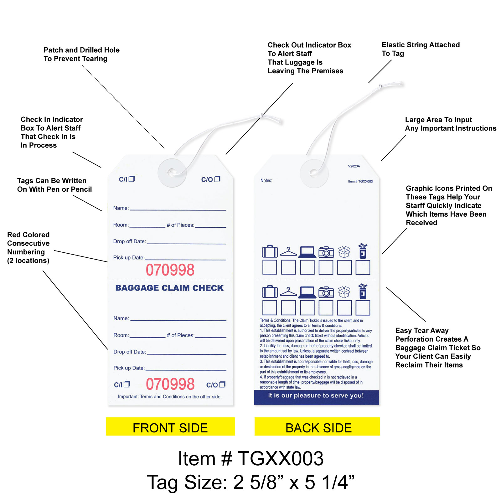 TGXX003SQBaggage claim check tags in English with elastic string are designed & manufactured to help in managing and controlling bags and luggage in hotels & where storage management is required. This tag is part of our deluxe product line.Usage