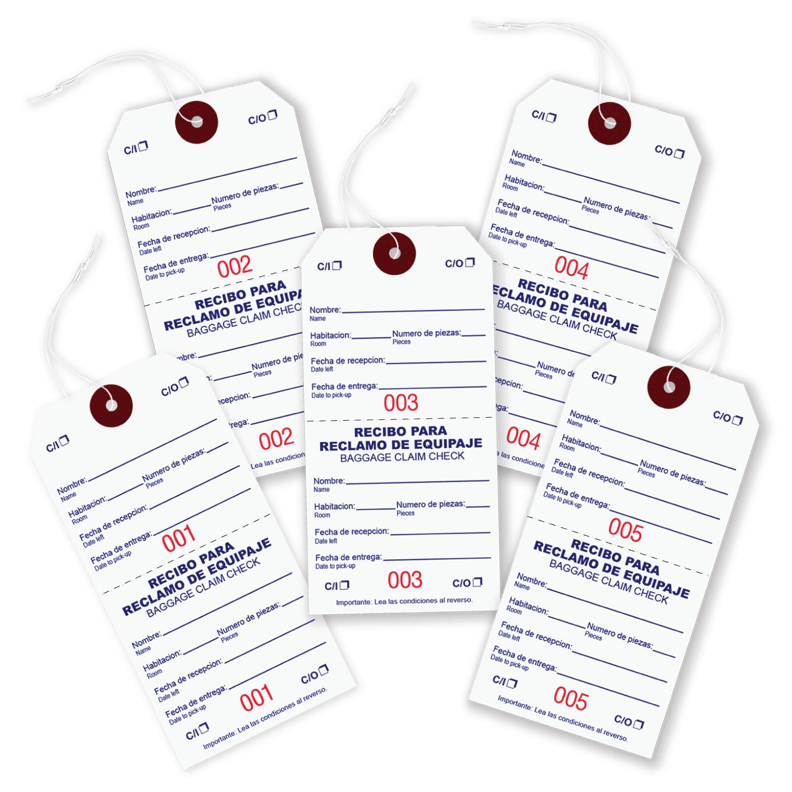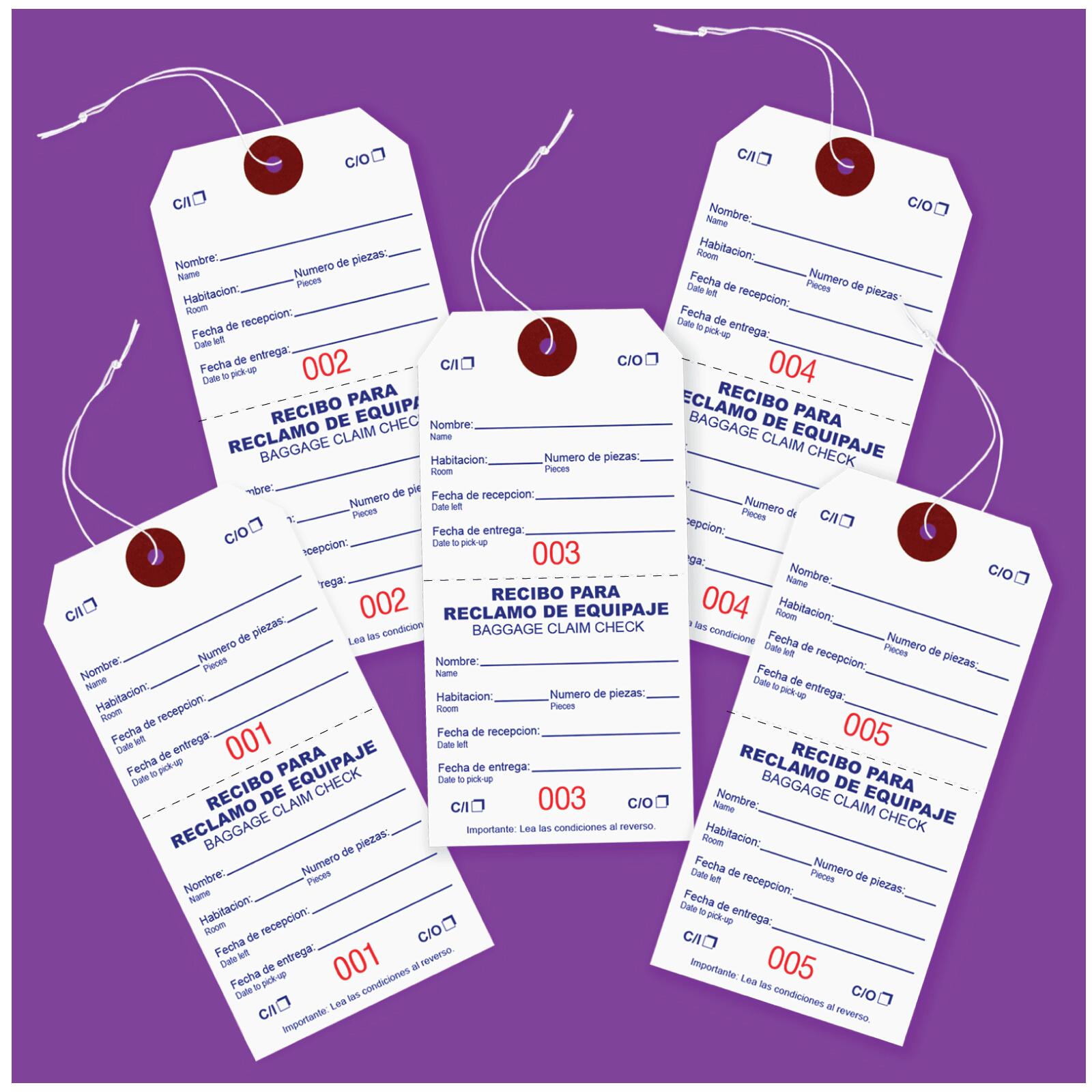TGXX005These bilingual baggage claim check tags are printed in English and Spanish with elastic string attached to the tag. Tags are designed & manufactured to help in managing and controlling bags and luggage in hotels & where storage management is required.Usage