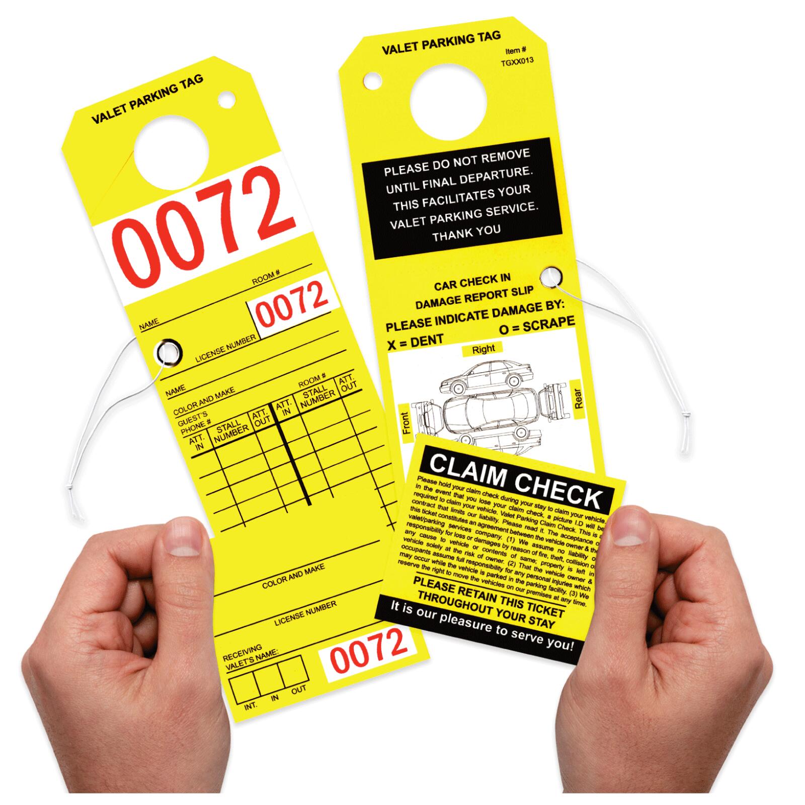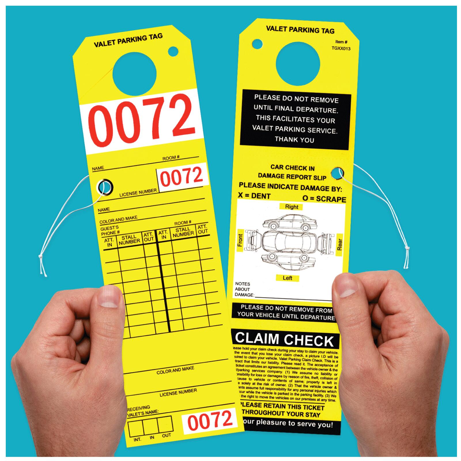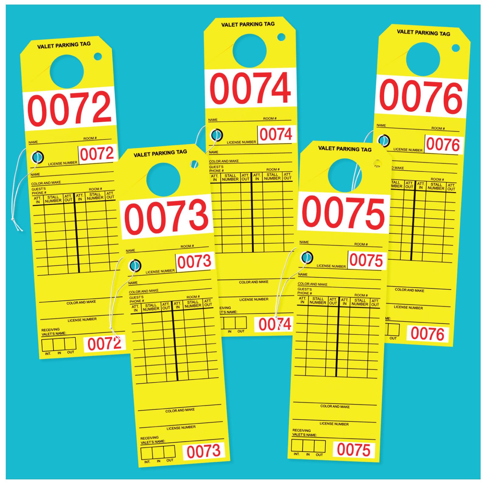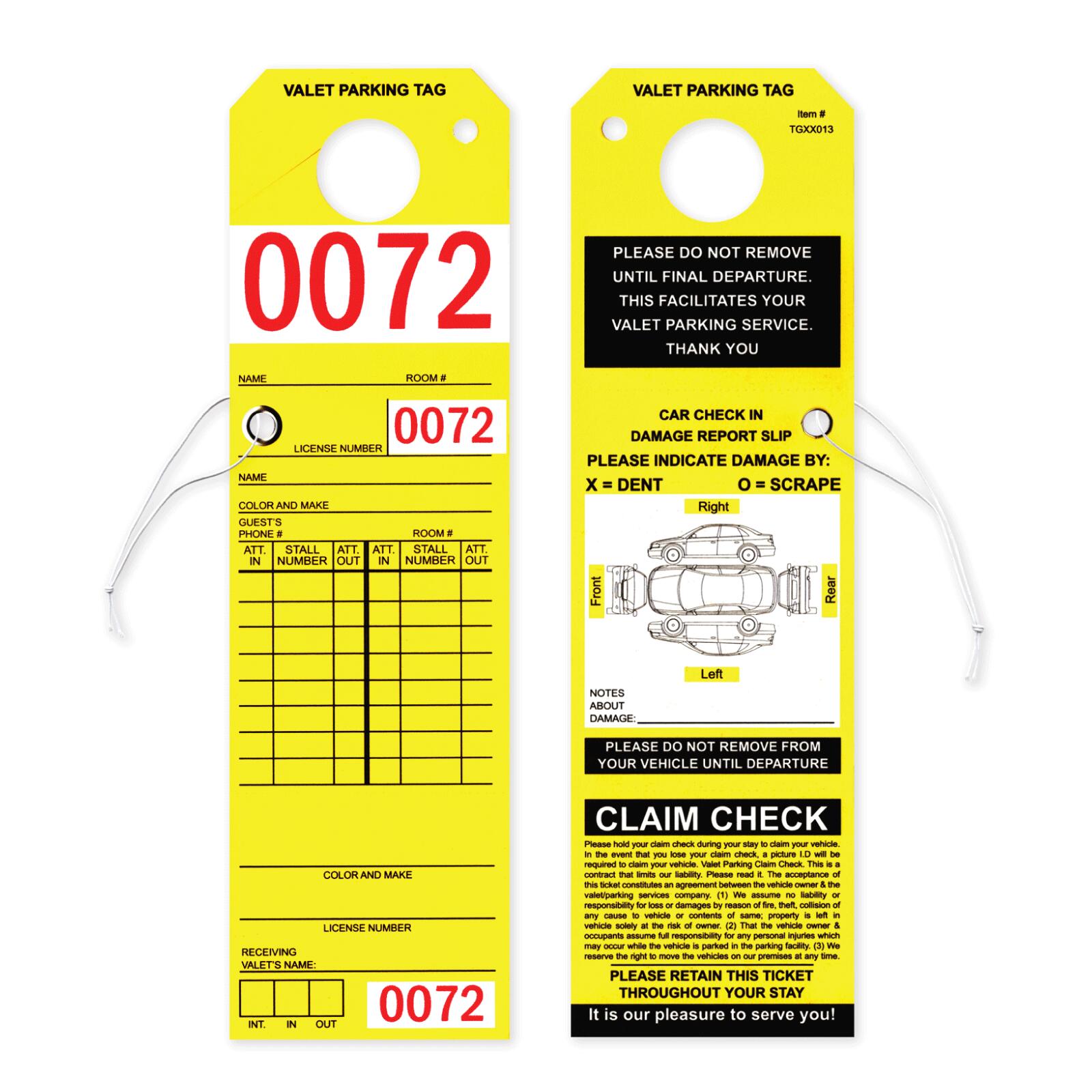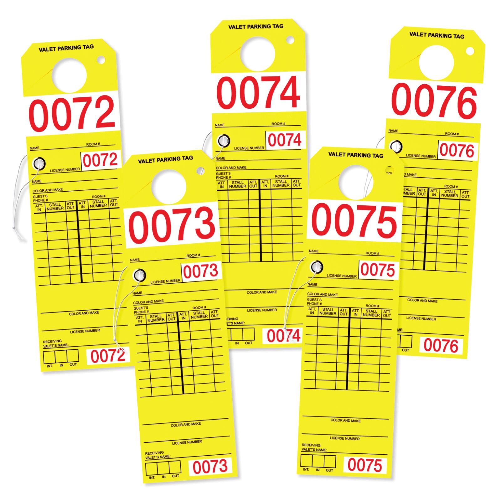 TGXX013CThese parking and valet tags are designed to help in managing and controlling parking and valet of cars in hotels, restaurants and parking lots. Tags are made on bright yellow tag cardstock and come with elastic string already attached to tag, making it easy to connect keys to tags. In addition, tags come with reinforced metal eyelet around hole to prevent tearing. Tags are consecutively numbered in big bold numbers making this the best parking and valet tag in the market. Each box is consecutively numbered with a different numbering sequence to prevent repeat numbering.Usage